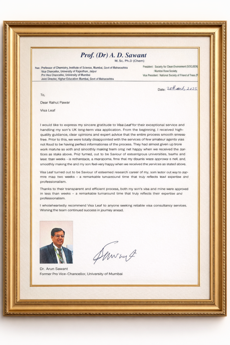 I would like to express my sincere gratitude to Visa Leaf for their exceptional service and support in handling my son's UK long-term visa application. From the beginning, I received high-quality guidance, clear opinions, and expert advice that made the entire process smooth and stress-free. Prior to this, we were totally disappointed with the services of few amateur agents as they were not found to be having perfect informations of the process. They had almost given up the work making us totally disappointed. Then I came across the Visa Leaf. The issues were resolved so well and smoothly making me and my son feel very happy when we received the services as stated above. Visa Leaf turned out to be Saviour of esteemed research career of my son by helping out of way to make him easy to join one of the most prestigious Universities having within top 30 global ranking. Thanks to their transparent and efficient process, both my son's visa and mine were approved in less than two weeks - a remarkable turnaround time that truly reflects their expertise and professionalism. wholeheartedly recommend Visa Leaf to anyone seeking reliable visa consultancy services. Wishing the team continued success in their journey ahead.